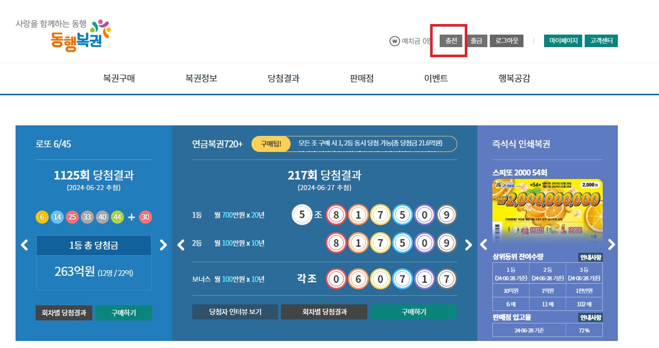 ④ 다음으로는 로또 구매를 위해 화면 상단의 충전 버튼을 눌러 예치금을 충전해야합니다.